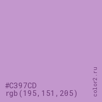 Цвет #C397CD в цветовой модели RGB обозначается тремя октетами (195, 151, 205) в десятичном формате и #C397CD в шестнадцатиричном (hex) формате, которые являются интенсивностью красного 195 (hex C3), интенсивность зелёного 151 (hex 97) и интенсивность синего 205 (hex CD).