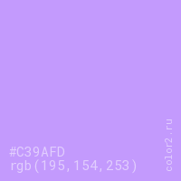 Цвет #C39AFD в цветовой модели RGB обозначается тремя октетами (195, 154, 253) в десятичном формате и #C39AFD в шестнадцатиричном (hex) формате, которые являются интенсивностью красного 195 (hex C3), интенсивность зелёного 154 (hex 9A) и интенсивность синего 253 (hex FD).