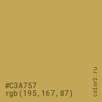 Цвет #C3A757 в цветовой модели RGB обозначается тремя октетами (195, 167, 87) в десятичном формате и #C3A757 в шестнадцатиричном (hex) формате, которые являются интенсивностью красного 195 (hex C3), интенсивность зелёного 167 (hex A7) и интенсивность синего 87 (hex 57).
