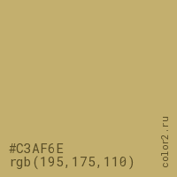 Цвет #C3AF6E в цветовой модели RGB обозначается тремя октетами (195, 175, 110) в десятичном формате и #C3AF6E в шестнадцатиричном (hex) формате, которые являются интенсивностью красного 195 (hex C3), интенсивность зелёного 175 (hex AF) и интенсивность синего 110 (hex 6E).