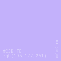 Цвет #C3B1FB в цветовой модели RGB обозначается тремя октетами (195, 177, 251) в десятичном формате и #C3B1FB в шестнадцатиричном (hex) формате, которые являются интенсивностью красного 195 (hex C3), интенсивность зелёного 177 (hex B1) и интенсивность синего 251 (hex FB).