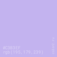 Цвет #C3B3EF в цветовой модели RGB обозначается тремя октетами (195, 179, 239) в десятичном формате и #C3B3EF в шестнадцатиричном (hex) формате, которые являются интенсивностью красного 195 (hex C3), интенсивность зелёного 179 (hex B3) и интенсивность синего 239 (hex EF).