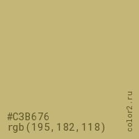 Цвет #C3B676 в цветовой модели RGB обозначается тремя октетами (195, 182, 118) в десятичном формате и #C3B676 в шестнадцатиричном (hex) формате, которые являются интенсивностью красного 195 (hex C3), интенсивность зелёного 182 (hex B6) и интенсивность синего 118 (hex 76).