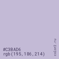 Цвет #C3BAD6 в цветовой модели RGB обозначается тремя октетами (195, 186, 214) в десятичном формате и #C3BAD6 в шестнадцатиричном (hex) формате, которые являются интенсивностью красного 195 (hex C3), интенсивность зелёного 186 (hex BA) и интенсивность синего 214 (hex D6).