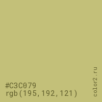 Цвет #C3C079 в цветовой модели RGB обозначается тремя октетами (195, 192, 121) в десятичном формате и #C3C079 в шестнадцатиричном (hex) формате, которые являются интенсивностью красного 195 (hex C3), интенсивность зелёного 192 (hex C0) и интенсивность синего 121 (hex 79).
