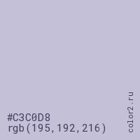 Цвет #C3C0D8 в цветовой модели RGB обозначается тремя октетами (195, 192, 216) в десятичном формате и #C3C0D8 в шестнадцатиричном (hex) формате, которые являются интенсивностью красного 195 (hex C3), интенсивность зелёного 192 (hex C0) и интенсивность синего 216 (hex D8).