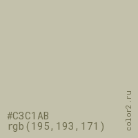 Цвет #C3C1AB в цветовой модели RGB обозначается тремя октетами (195, 193, 171) в десятичном формате и #C3C1AB в шестнадцатиричном (hex) формате, которые являются интенсивностью красного 195 (hex C3), интенсивность зелёного 193 (hex C1) и интенсивность синего 171 (hex AB).