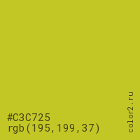 Цвет #C3C725 в цветовой модели RGB обозначается тремя октетами (195, 199, 37) в десятичном формате и #C3C725 в шестнадцатиричном (hex) формате, которые являются интенсивностью красного 195 (hex C3), интенсивность зелёного 199 (hex C7) и интенсивность синего 37 (hex 25).