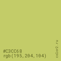 Цвет #C3CC68 в цветовой модели RGB обозначается тремя октетами (195, 204, 104) в десятичном формате и #C3CC68 в шестнадцатиричном (hex) формате, которые являются интенсивностью красного 195 (hex C3), интенсивность зелёного 204 (hex CC) и интенсивность синего 104 (hex 68).