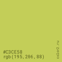 Цвет #C3CE58 в цветовой модели RGB обозначается тремя октетами (195, 206, 88) в десятичном формате и #C3CE58 в шестнадцатиричном (hex) формате, которые являются интенсивностью красного 195 (hex C3), интенсивность зелёного 206 (hex CE) и интенсивность синего 88 (hex 58).