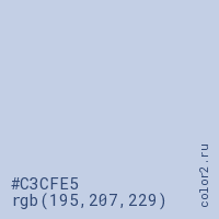 Цвет #C3CFE5 в цветовой модели RGB обозначается тремя октетами (195, 207, 229) в десятичном формате и #C3CFE5 в шестнадцатиричном (hex) формате, которые являются интенсивностью красного 195 (hex C3), интенсивность зелёного 207 (hex CF) и интенсивность синего 229 (hex E5).