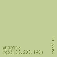 Цвет #C3D095 в цветовой модели RGB обозначается тремя октетами (195, 208, 149) в десятичном формате и #C3D095 в шестнадцатиричном (hex) формате, которые являются интенсивностью красного 195 (hex C3), интенсивность зелёного 208 (hex D0) и интенсивность синего 149 (hex 95).