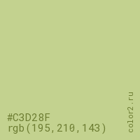 Цвет #C3D28F в цветовой модели RGB обозначается тремя октетами (195, 210, 143) в десятичном формате и #C3D28F в шестнадцатиричном (hex) формате, которые являются интенсивностью красного 195 (hex C3), интенсивность зелёного 210 (hex D2) и интенсивность синего 143 (hex 8F).