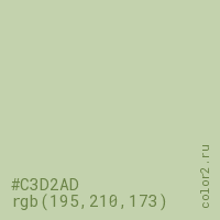 Цвет #C3D2AD в цветовой модели RGB обозначается тремя октетами (195, 210, 173) в десятичном формате и #C3D2AD в шестнадцатиричном (hex) формате, которые являются интенсивностью красного 195 (hex C3), интенсивность зелёного 210 (hex D2) и интенсивность синего 173 (hex AD).