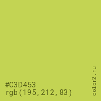 Цвет #C3D453 в цветовой модели RGB обозначается тремя октетами (195, 212, 83) в десятичном формате и #C3D453 в шестнадцатиричном (hex) формате, которые являются интенсивностью красного 195 (hex C3), интенсивность зелёного 212 (hex D4) и интенсивность синего 83 (hex 53).