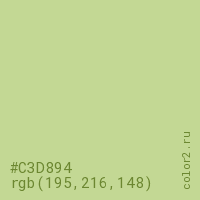 Цвет #C3D894 в цветовой модели RGB обозначается тремя октетами (195, 216, 148) в десятичном формате и #C3D894 в шестнадцатиричном (hex) формате, которые являются интенсивностью красного 195 (hex C3), интенсивность зелёного 216 (hex D8) и интенсивность синего 148 (hex 94).