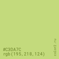 Цвет #C3DA7C в цветовой модели RGB обозначается тремя октетами (195, 218, 124) в десятичном формате и #C3DA7C в шестнадцатиричном (hex) формате, которые являются интенсивностью красного 195 (hex C3), интенсивность зелёного 218 (hex DA) и интенсивность синего 124 (hex 7C).