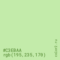 Цвет #C3EBAA в цветовой модели RGB обозначается тремя октетами (195, 235, 170) в десятичном формате и #C3EBAA в шестнадцатиричном (hex) формате, которые являются интенсивностью красного 195 (hex C3), интенсивность зелёного 235 (hex EB) и интенсивность синего 170 (hex AA).