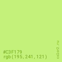 Цвет #C3F179 в цветовой модели RGB обозначается тремя октетами (195, 241, 121) в десятичном формате и #C3F179 в шестнадцатиричном (hex) формате, которые являются интенсивностью красного 195 (hex C3), интенсивность зелёного 241 (hex F1) и интенсивность синего 121 (hex 79).