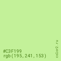 Цвет #C3F199 в цветовой модели RGB обозначается тремя октетами (195, 241, 153) в десятичном формате и #C3F199 в шестнадцатиричном (hex) формате, которые являются интенсивностью красного 195 (hex C3), интенсивность зелёного 241 (hex F1) и интенсивность синего 153 (hex 99).
