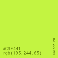 Цвет #C3F441 в цветовой модели RGB обозначается тремя октетами (195, 244, 65) в десятичном формате и #C3F441 в шестнадцатиричном (hex) формате, которые являются интенсивностью красного 195 (hex C3), интенсивность зелёного 244 (hex F4) и интенсивность синего 65 (hex 41).