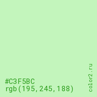 Цвет #C3F5BC в цветовой модели RGB обозначается тремя октетами (195, 245, 188) в десятичном формате и #C3F5BC в шестнадцатиричном (hex) формате, которые являются интенсивностью красного 195 (hex C3), интенсивность зелёного 245 (hex F5) и интенсивность синего 188 (hex BC).