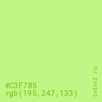 Цвет #C3F785 в цветовой модели RGB обозначается тремя октетами (195, 247, 133) в десятичном формате и #C3F785 в шестнадцатиричном (hex) формате, которые являются интенсивностью красного 195 (hex C3), интенсивность зелёного 247 (hex F7) и интенсивность синего 133 (hex 85).