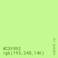 Цвет #C3F892 в цветовой модели RGB обозначается тремя октетами (195, 248, 146) в десятичном формате и #C3F892 в шестнадцатиричном (hex) формате, которые являются интенсивностью красного 195 (hex C3), интенсивность зелёного 248 (hex F8) и интенсивность синего 146 (hex 92).