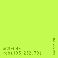 Цвет #C3FC4F в цветовой модели RGB обозначается тремя октетами (195, 252, 79) в десятичном формате и #C3FC4F в шестнадцатиричном (hex) формате, которые являются интенсивностью красного 195 (hex C3), интенсивность зелёного 252 (hex FC) и интенсивность синего 79 (hex 4F).