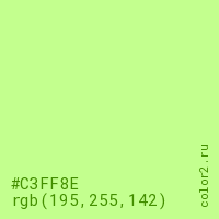 Цвет #C3FF8E в цветовой модели RGB обозначается тремя октетами (195, 255, 142) в десятичном формате и #C3FF8E в шестнадцатиричном (hex) формате, которые являются интенсивностью красного 195 (hex C3), интенсивность зелёного 255 (hex FF) и интенсивность синего 142 (hex 8E).