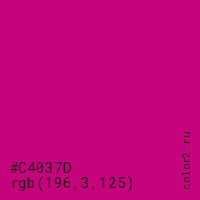 Цвет #C4037D в цветовой модели RGB обозначается тремя октетами (196, 3, 125) в десятичном формате и #C4037D в шестнадцатиричном (hex) формате, которые являются интенсивностью красного 196 (hex C4), интенсивность зелёного 3 (hex 03) и интенсивность синего 125 (hex 7D).