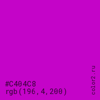 Цвет #C404C8 в цветовой модели RGB обозначается тремя октетами (196, 4, 200) в десятичном формате и #C404C8 в шестнадцатиричном (hex) формате, которые являются интенсивностью красного 196 (hex C4), интенсивность зелёного 4 (hex 04) и интенсивность синего 200 (hex C8).