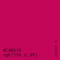 Цвет #C40659 в цветовой модели RGB обозначается тремя октетами (196, 6, 89) в десятичном формате и #C40659 в шестнадцатиричном (hex) формате, которые являются интенсивностью красного 196 (hex C4), интенсивность зелёного 6 (hex 06) и интенсивность синего 89 (hex 59).