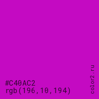 Цвет #C40AC2 в цветовой модели RGB обозначается тремя октетами (196, 10, 194) в десятичном формате и #C40AC2 в шестнадцатиричном (hex) формате, которые являются интенсивностью красного 196 (hex C4), интенсивность зелёного 10 (hex 0A) и интенсивность синего 194 (hex C2).