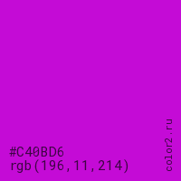 Цвет #C40BD6 в цветовой модели RGB обозначается тремя октетами (196, 11, 214) в десятичном формате и #C40BD6 в шестнадцатиричном (hex) формате, которые являются интенсивностью красного 196 (hex C4), интенсивность зелёного 11 (hex 0B) и интенсивность синего 214 (hex D6).