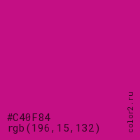 Цвет #C40F84 в цветовой модели RGB обозначается тремя октетами (196, 15, 132) в десятичном формате и #C40F84 в шестнадцатиричном (hex) формате, которые являются интенсивностью красного 196 (hex C4), интенсивность зелёного 15 (hex 0F) и интенсивность синего 132 (hex 84).
