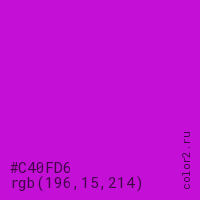Цвет #C40FD6 в цветовой модели RGB обозначается тремя октетами (196, 15, 214) в десятичном формате и #C40FD6 в шестнадцатиричном (hex) формате, которые являются интенсивностью красного 196 (hex C4), интенсивность зелёного 15 (hex 0F) и интенсивность синего 214 (hex D6).
