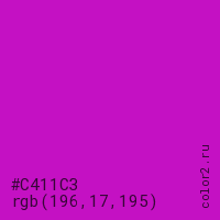 Цвет #C411C3 в цветовой модели RGB обозначается тремя октетами (196, 17, 195) в десятичном формате и #C411C3 в шестнадцатиричном (hex) формате, которые являются интенсивностью красного 196 (hex C4), интенсивность зелёного 17 (hex 11) и интенсивность синего 195 (hex C3).