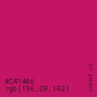 Цвет #C41466 в цветовой модели RGB обозначается тремя октетами (196, 20, 102) в десятичном формате и #C41466 в шестнадцатиричном (hex) формате, которые являются интенсивностью красного 196 (hex C4), интенсивность зелёного 20 (hex 14) и интенсивность синего 102 (hex 66).