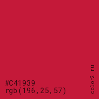 Цвет #C41939 в цветовой модели RGB обозначается тремя октетами (196, 25, 57) в десятичном формате и #C41939 в шестнадцатиричном (hex) формате, которые являются интенсивностью красного 196 (hex C4), интенсивность зелёного 25 (hex 19) и интенсивность синего 57 (hex 39).