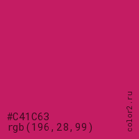 Цвет #C41C63 в цветовой модели RGB обозначается тремя октетами (196, 28, 99) в десятичном формате и #C41C63 в шестнадцатиричном (hex) формате, которые являются интенсивностью красного 196 (hex C4), интенсивность зелёного 28 (hex 1C) и интенсивность синего 99 (hex 63).