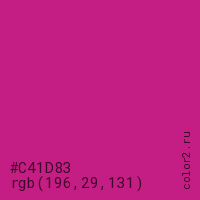 Цвет #C41D83 в цветовой модели RGB обозначается тремя октетами (196, 29, 131) в десятичном формате и #C41D83 в шестнадцатиричном (hex) формате, которые являются интенсивностью красного 196 (hex C4), интенсивность зелёного 29 (hex 1D) и интенсивность синего 131 (hex 83).