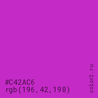 Цвет #C42AC6 в цветовой модели RGB обозначается тремя октетами (196, 42, 198) в десятичном формате и #C42AC6 в шестнадцатиричном (hex) формате, которые являются интенсивностью красного 196 (hex C4), интенсивность зелёного 42 (hex 2A) и интенсивность синего 198 (hex C6).
