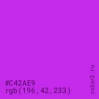 Цвет #C42AE9 в цветовой модели RGB обозначается тремя октетами (196, 42, 233) в десятичном формате и #C42AE9 в шестнадцатиричном (hex) формате, которые являются интенсивностью красного 196 (hex C4), интенсивность зелёного 42 (hex 2A) и интенсивность синего 233 (hex E9).