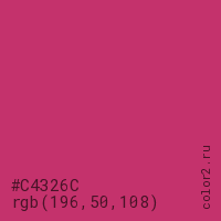 Цвет #C4326C в цветовой модели RGB обозначается тремя октетами (196, 50, 108) в десятичном формате и #C4326C в шестнадцатиричном (hex) формате, которые являются интенсивностью красного 196 (hex C4), интенсивность зелёного 50 (hex 32) и интенсивность синего 108 (hex 6C).