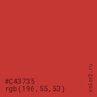 Цвет #C43735 в цветовой модели RGB обозначается тремя октетами (196, 55, 53) в десятичном формате и #C43735 в шестнадцатиричном (hex) формате, которые являются интенсивностью красного 196 (hex C4), интенсивность зелёного 55 (hex 37) и интенсивность синего 53 (hex 35).
