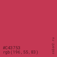 Цвет #C43753 в цветовой модели RGB обозначается тремя октетами (196, 55, 83) в десятичном формате и #C43753 в шестнадцатиричном (hex) формате, которые являются интенсивностью красного 196 (hex C4), интенсивность зелёного 55 (hex 37) и интенсивность синего 83 (hex 53).
