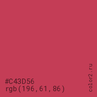 Цвет #C43D56 в цветовой модели RGB обозначается тремя октетами (196, 61, 86) в десятичном формате и #C43D56 в шестнадцатиричном (hex) формате, которые являются интенсивностью красного 196 (hex C4), интенсивность зелёного 61 (hex 3D) и интенсивность синего 86 (hex 56).