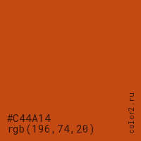 Цвет #C44A14 в цветовой модели RGB обозначается тремя октетами (196, 74, 20) в десятичном формате и #C44A14 в шестнадцатиричном (hex) формате, которые являются интенсивностью красного 196 (hex C4), интенсивность зелёного 74 (hex 4A) и интенсивность синего 20 (hex 14).