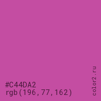 Цвет #C44DA2 в цветовой модели RGB обозначается тремя октетами (196, 77, 162) в десятичном формате и #C44DA2 в шестнадцатиричном (hex) формате, которые являются интенсивностью красного 196 (hex C4), интенсивность зелёного 77 (hex 4D) и интенсивность синего 162 (hex A2).